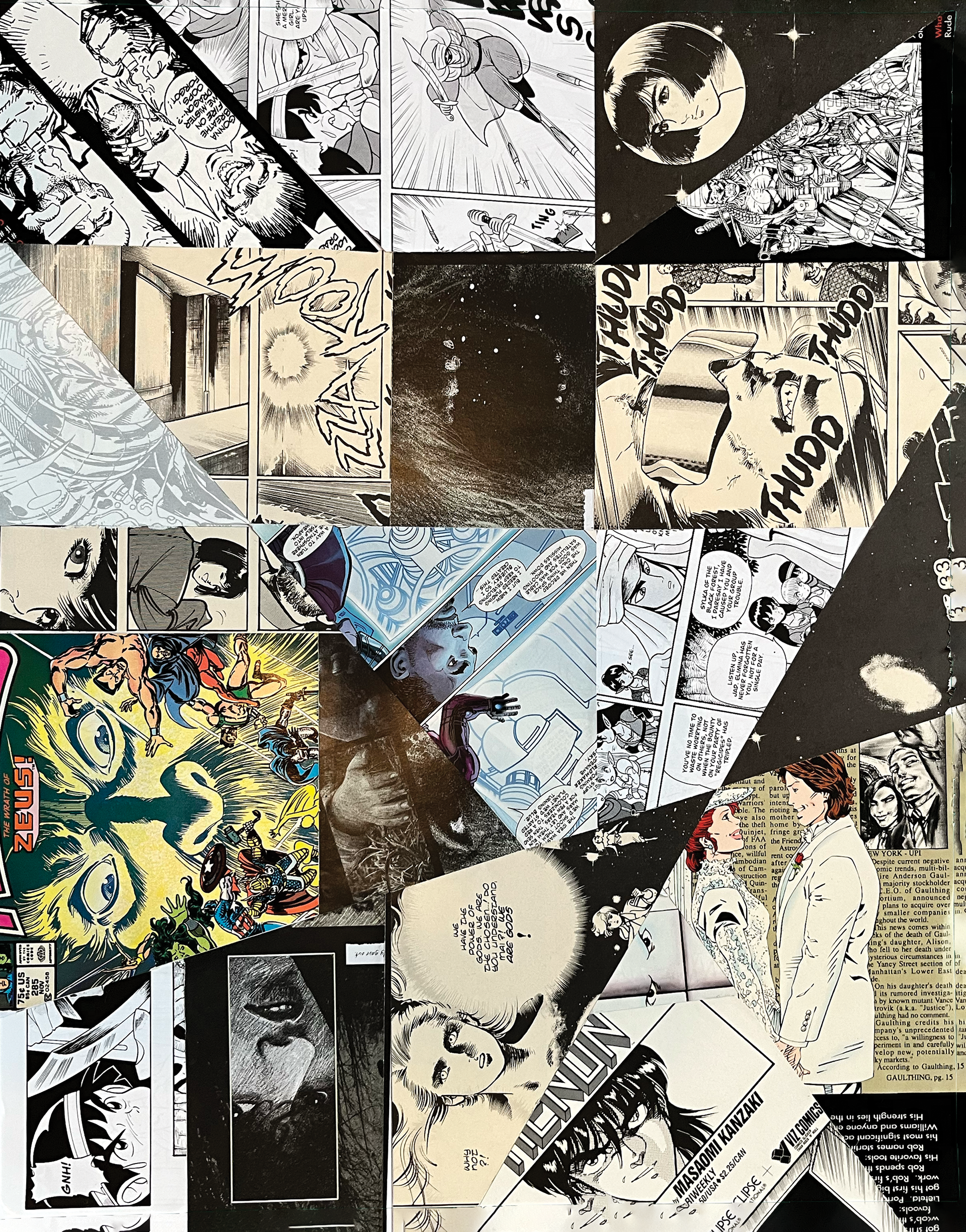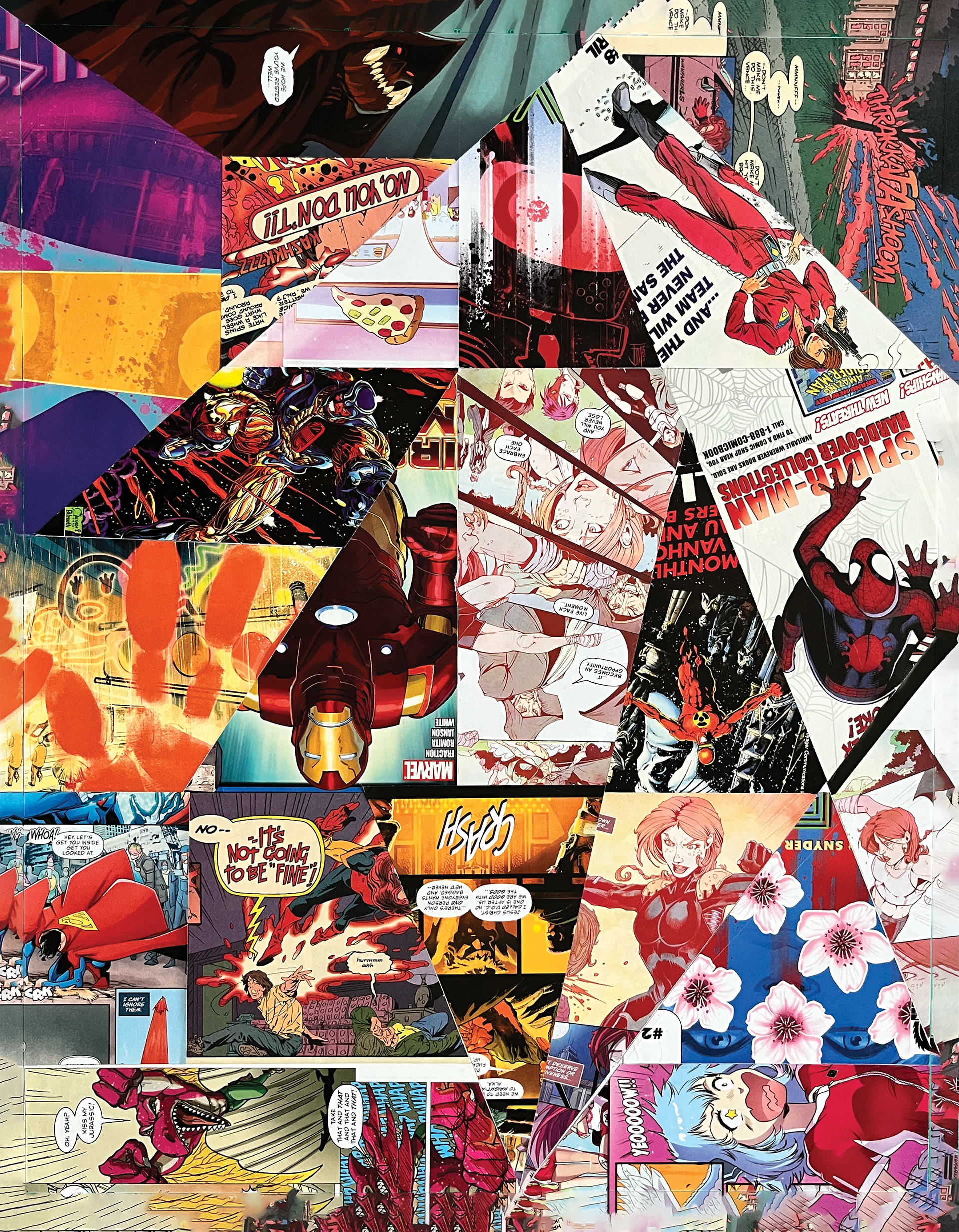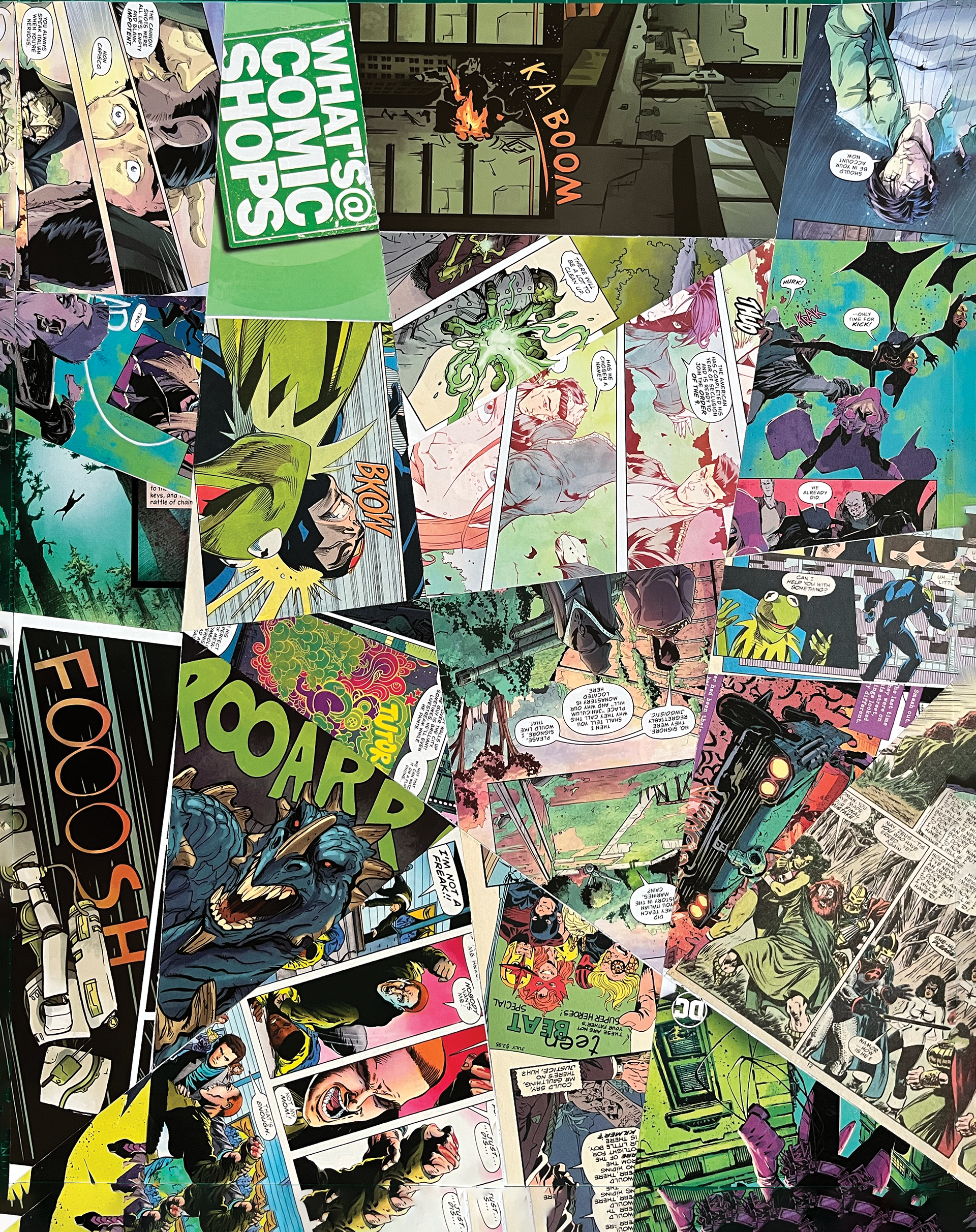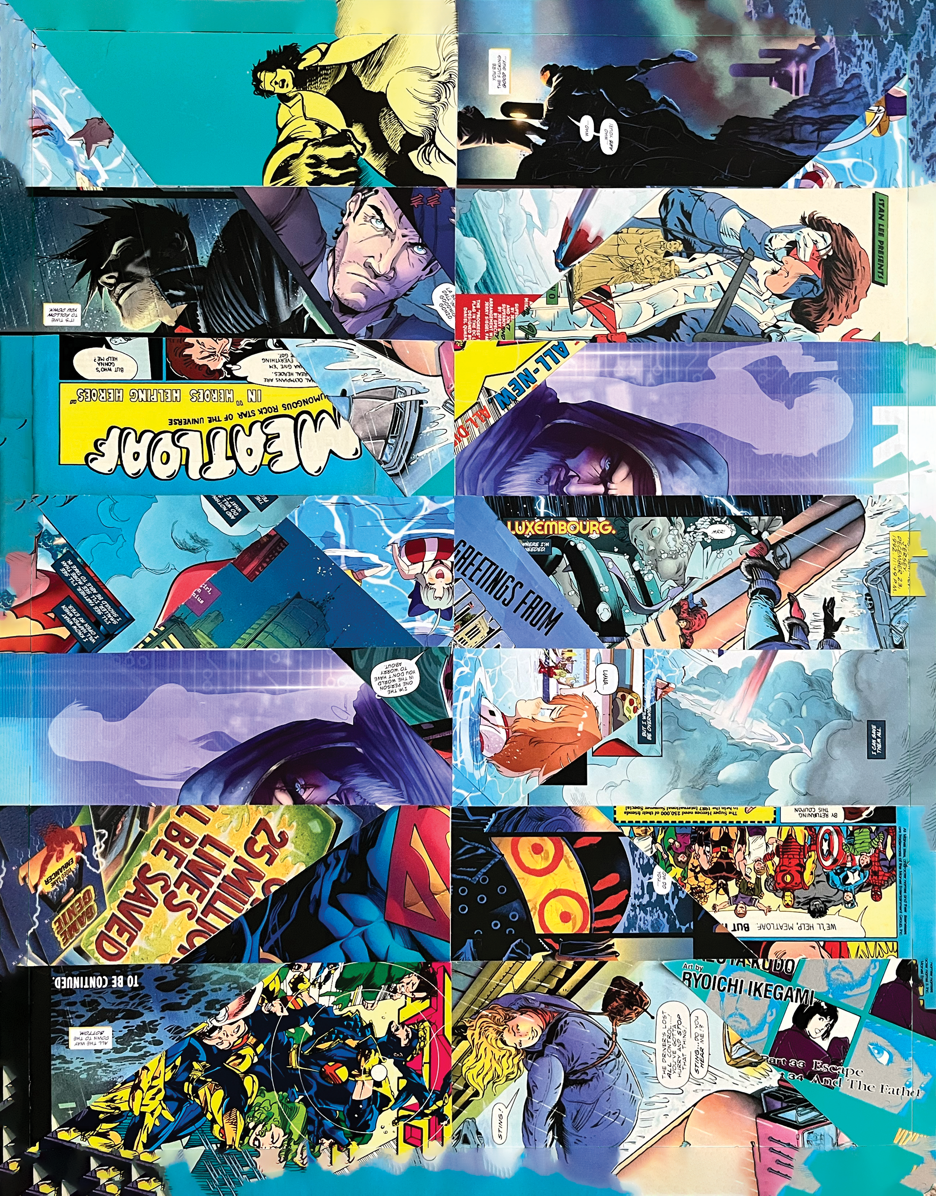 In the end, the Mylar background wasn’t working, so I replaced it with a grid of vintage comic books. This choice reinforced the theme and better connected the posters conceptually. The grid ultimately became the unified background for the series.