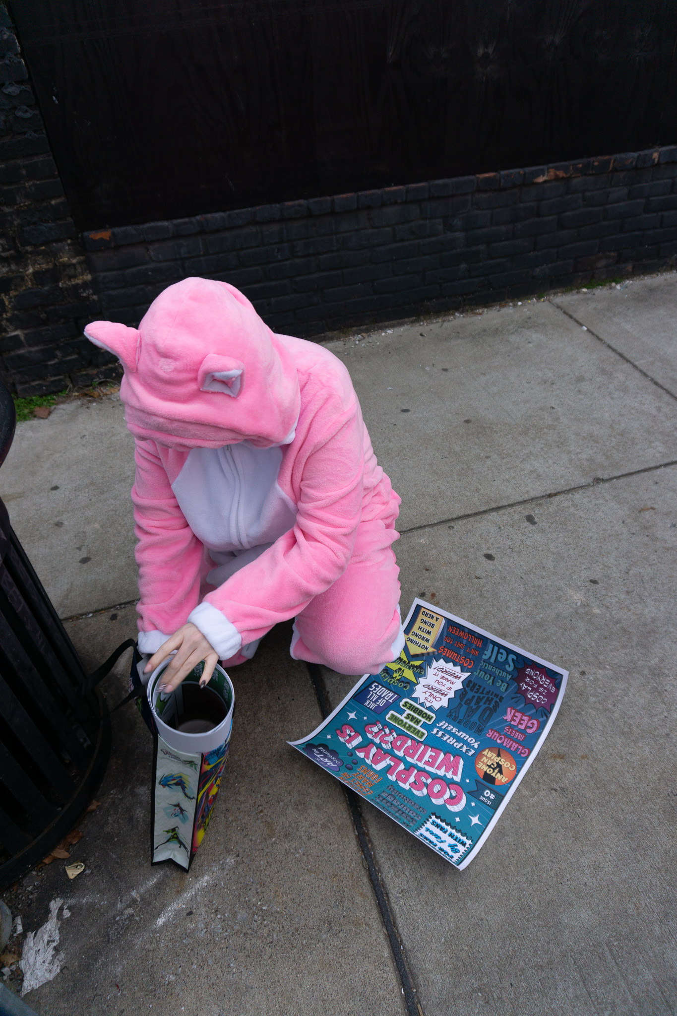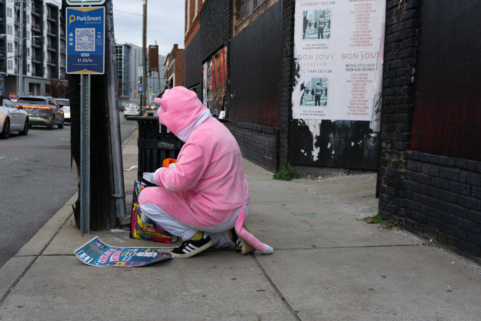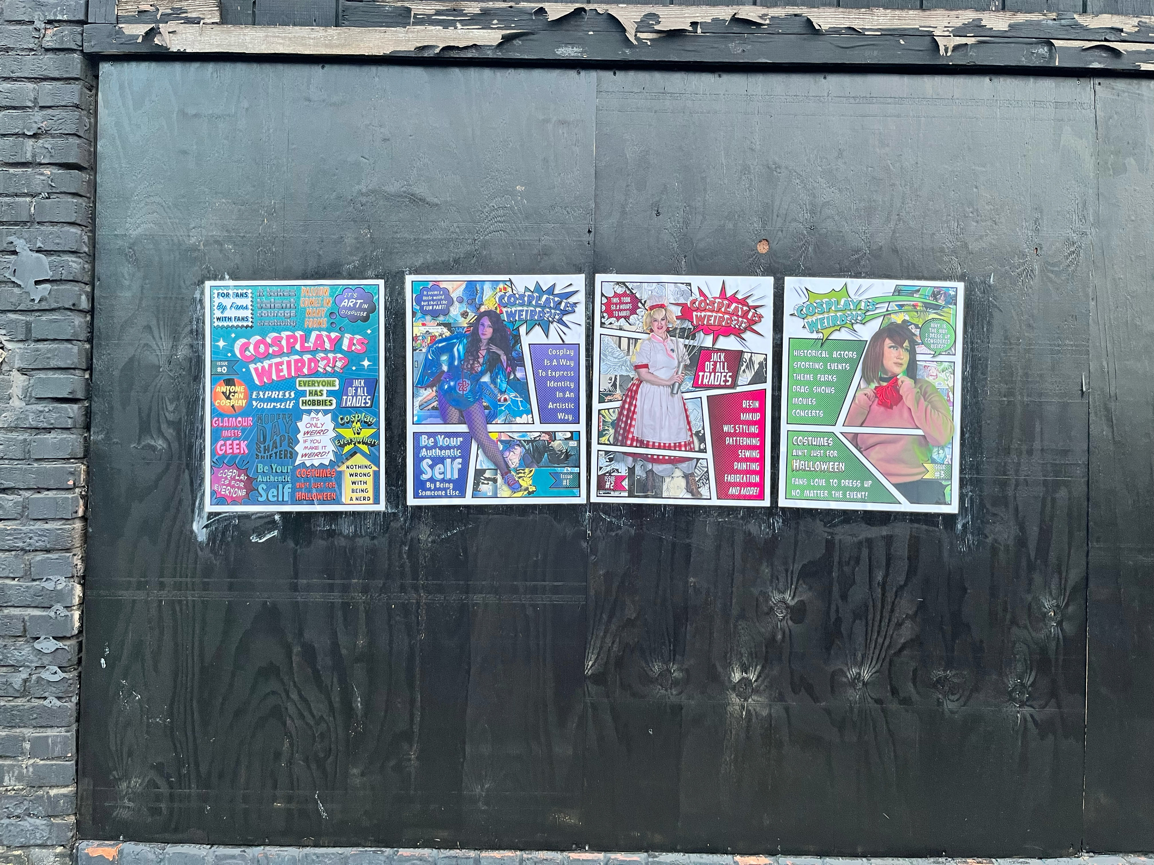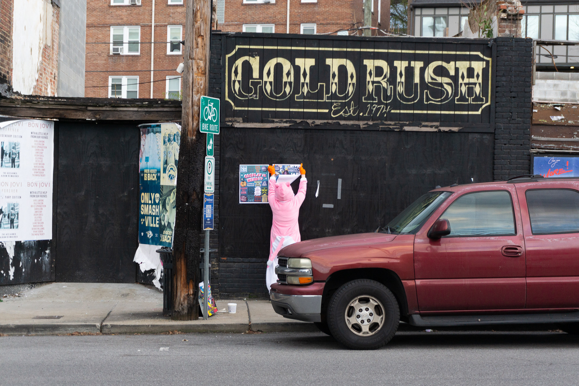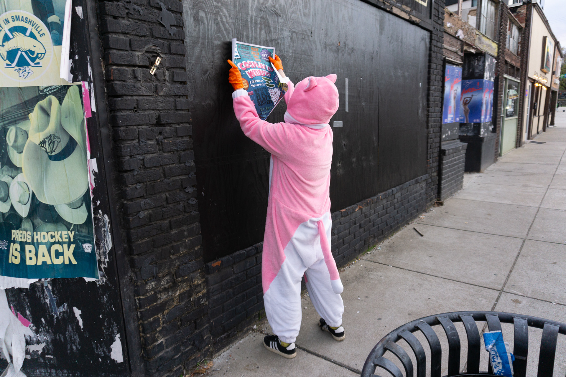 As a final component, the work was installed in a public space, which required learning how to make or source wheat paste and properly apply the posters so they could be viewed “in the wild.” To fully commit to the theme, I installed the work in cosplay, headed into downtown Nashville on a windy 30-degree day dressed as a giant pink cat to put up the posters.